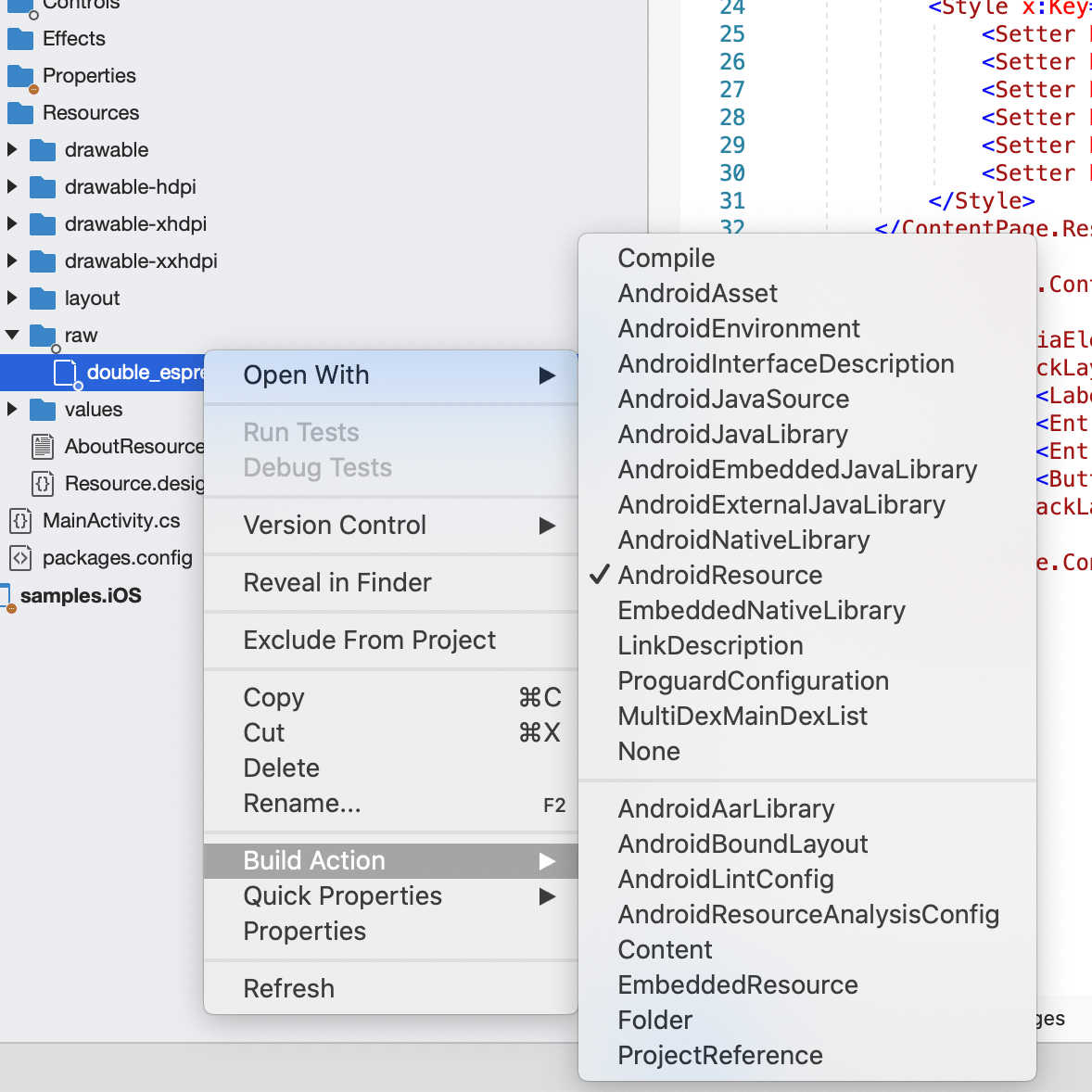 Before we get too far along, we’ll need to organize some resources. Grab any looping video of your choice (I found one on coverr.co which suited my needs) and copy it to each platform resource folder. For android, that’ll be Resources/raw/your_file.mp4 (if you haven’t added platform resources before, you’ll probably need to create this folder) and set the build action to be AndroidResource. Likewise for iOS, add your file to Resources/your_file.mp4 and ensure the file is set to build as a BundleResource.
