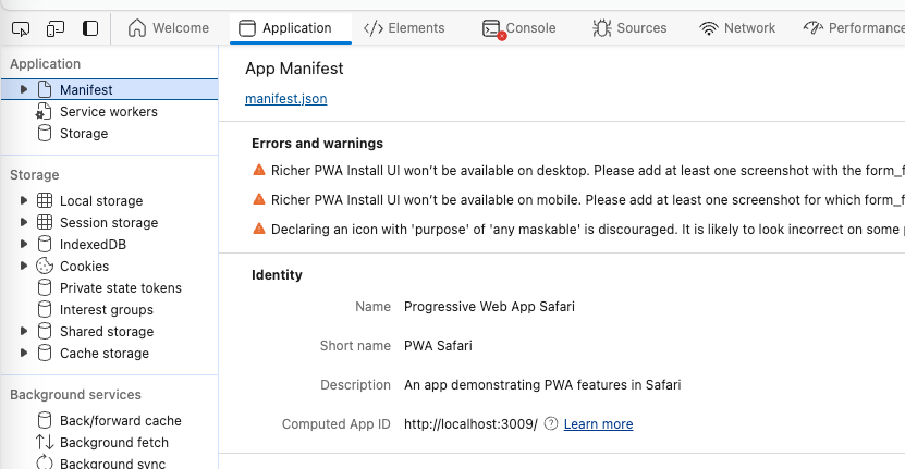Again, this could be handled with plain JavaScript/typescript calls, but we can rely on serwist to get us out instance of service worker at any point during code execution. Before we validate our features on Safari for iOS, we want to check some things in a desktop browser of your choosing. I’m using Chromium-based Edge, but Google Chrome, and Firefox are also good choices thanks to their robust developer tooling. Safari for desktop could work (and indeed, we’ll want to test there too when we test for Safari mobile!) but I find their tooling is not quite as robust. Your mileage may vary.