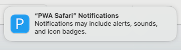 Much like for iOS, you may not see this request (or get a “denied” error) in desktop Safari if the web app hasn’t been added to your dock. On other browsers, you may get a popup message naturally or need to explicitly allow push notifications from the navigation bar (which can happen if a certain URL frequently is asking for a permission) but without the need to “install” the PWA: