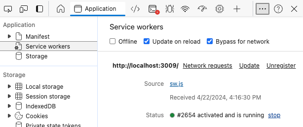 Restart your dev server and launch the URL (in my case, localhost:3009) in your testing browser and open the dev inspector. Here are some tells that indicate our service worker is ready to work: