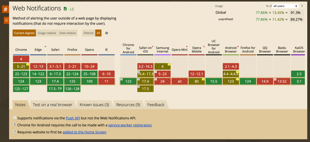 - Browsers with smaller market share may not support push notifications at all; as always, caniuse is a great resource for understanding the compatibility landscape