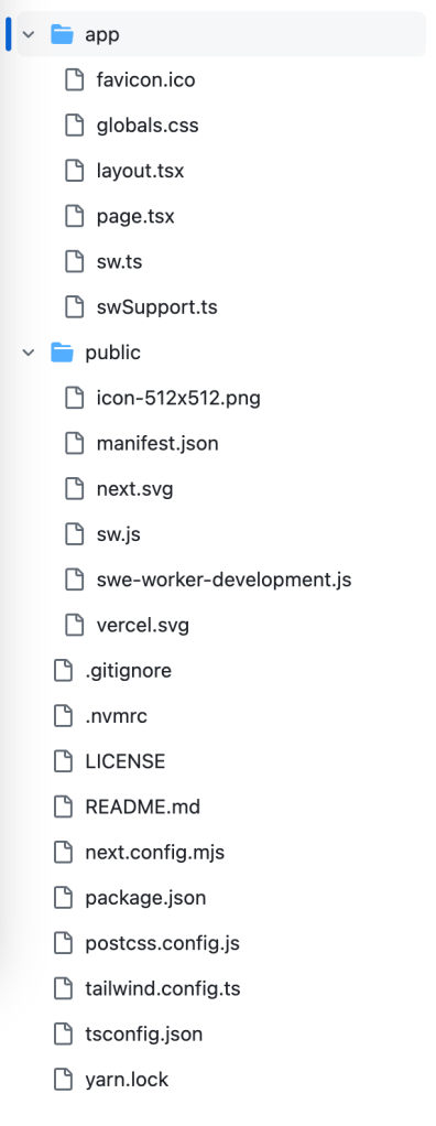 N.B – if you used the default options for create-next-app@latest your sw.ts file may be at src/app/sw.ts. At this point, running next dev should compile sw.ts (our swSrc) into a service worker file, sw.js in the public folder (our swDest). To fully enable the power of the service worker, we need a few more items, specifically a manifest. Make a new file at public/manifest.json with the following contents